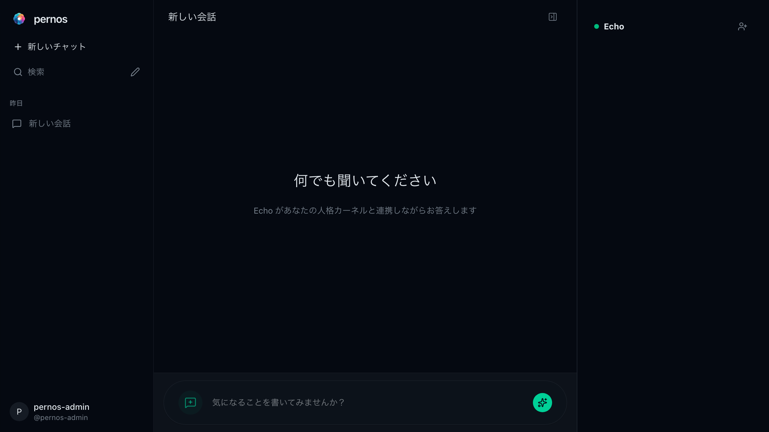 Pernos™ は、ひとつの問いを複数の視点で考えるためのプロダクトです。性格の異なる AI と話し比べながら、アイデアを広げ、見えていない論点を拾えます。裏側では、心理学の Big Five(OCEAN)理論を基盤にした人格モデルが動いています。