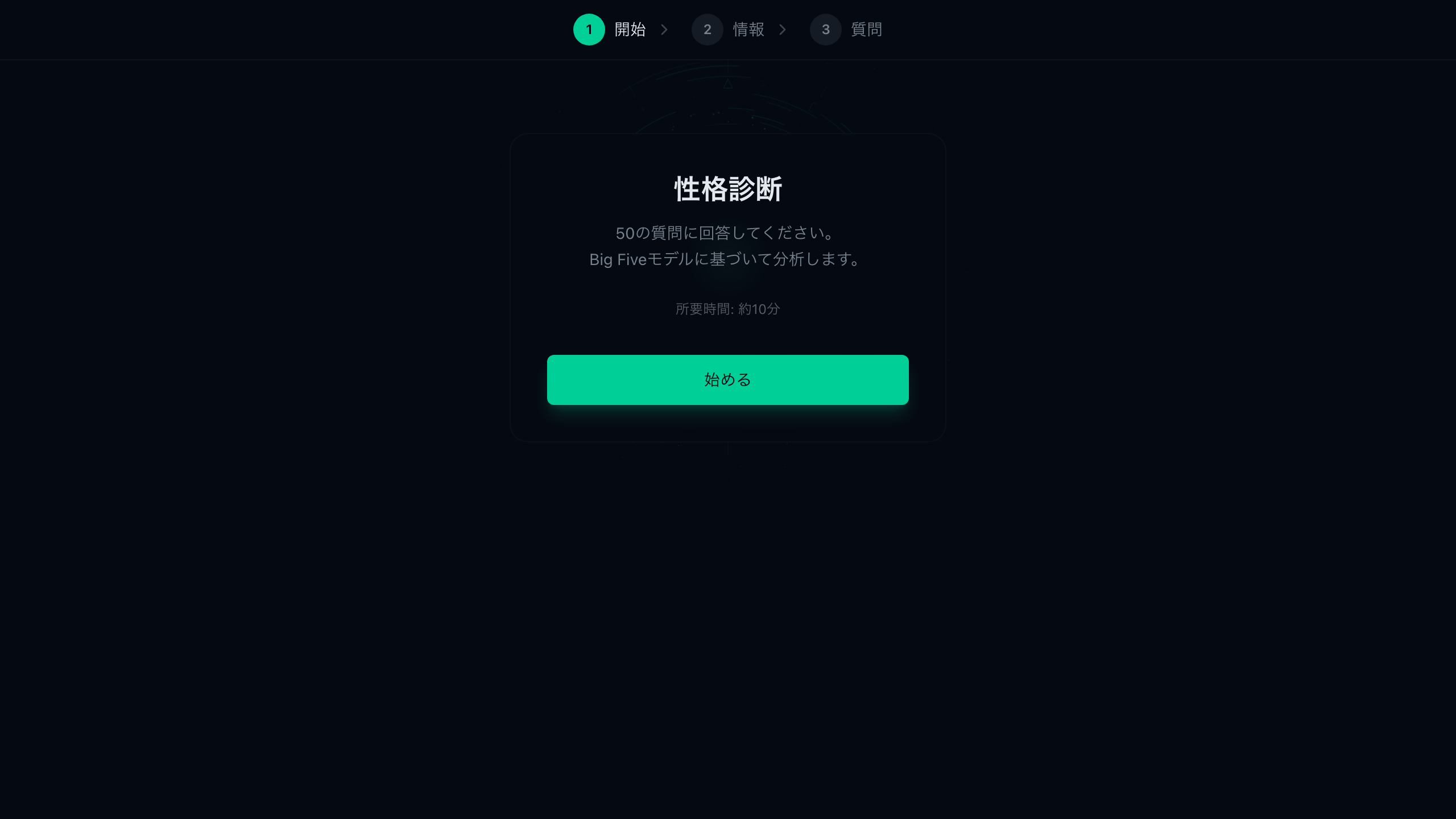 OCEAN理論に基づく適応型の人格測定。少ない質問で高精度に32タイプから判定し、自分の考え方や対話のクセを把握できます。複数視点の体験に入る前の準備としても使えます。